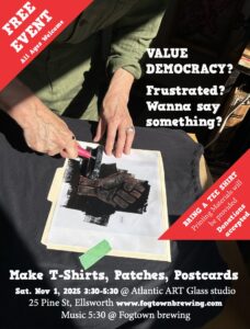 Nov 1, 3:30-5:30 at 25 Pine St, at Artsworth/Atlantic Art Glass Studio in Ellsworth. Make a teeshirt before you head to a rally or stay for music at Fogtown starting at 5:30.