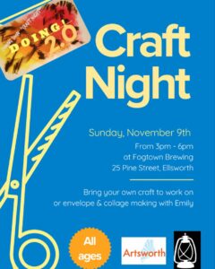 What is the purpose of craft night? It is a night to work together, talk together, laugh, and support each other while DOING something with our hands and moving our projects towards completion! So, bring a project you are working on or check out the featured craft collage project demonstrated by Emily Michaud.10% of the proceeds from Fogtown sales will be donated to Artsworth! so think about having a lovely brew with or without alcohol and a delicious artistic Wood Fired Pizza while you craft away...