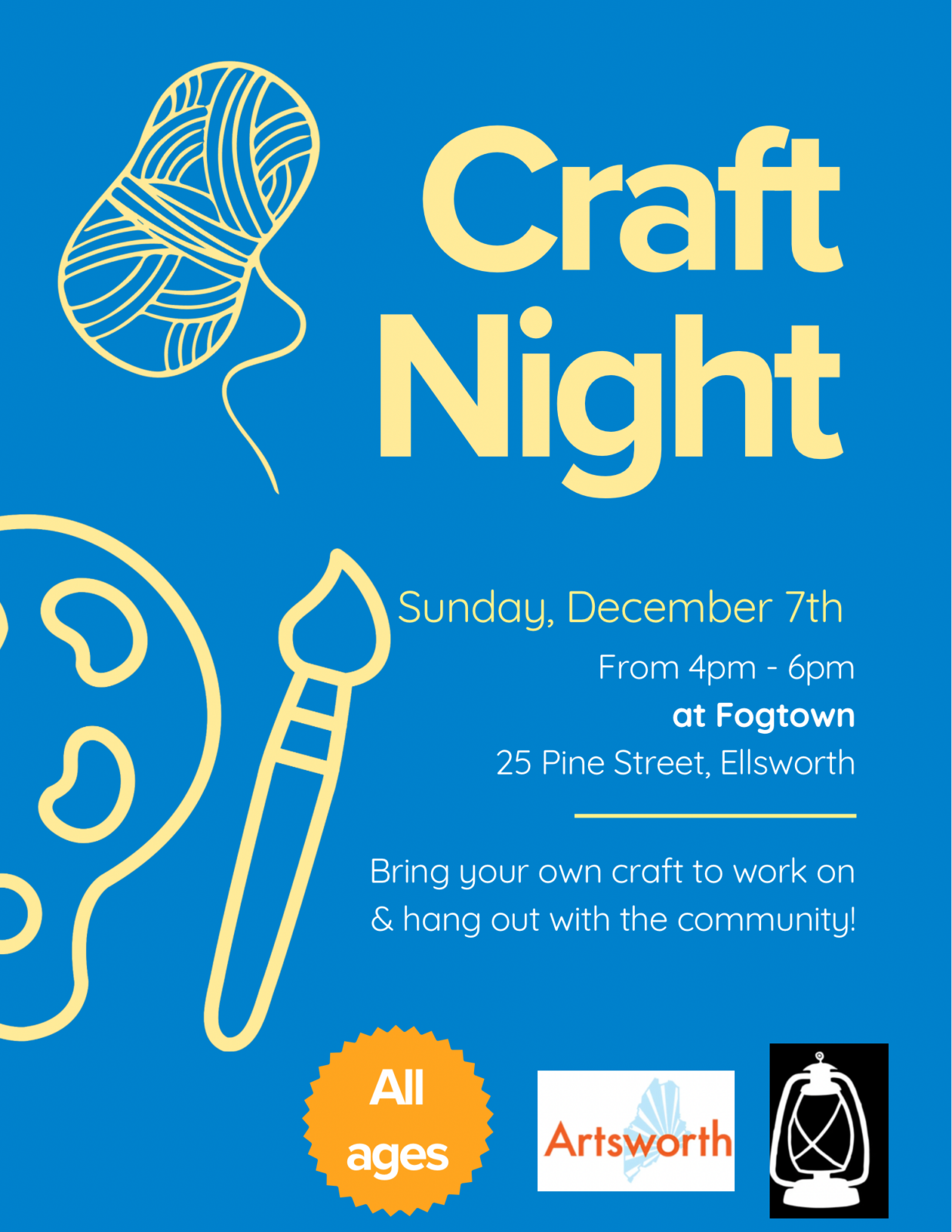 What is the purpose of craft night? It is a night to work together, talk together, laugh, and support each other while DOING something with our hands and moving our projects towards completion!10% of the proceeds from Fogtown sales will be donated to Artsworth! so think about having a lovely brew with or without alcohol and a delicious artistic Wood Fired Pizza while you craft away...